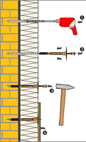 • Дюбелирование. Установка тарельчатых дюбелей, способствующих надежному удержанию материала.