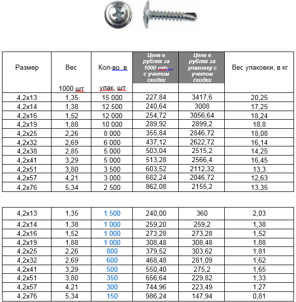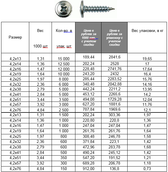 • От вида упаковки У нас в продаже присутствуют три вида упаковки на каждое изделие: Маленькая (блистерная) упаковка, Средняя (картонная с окошком) упаковка, Большая (промышленная, картонная) упаковка. Чем больше упаковка, тем меньше цена за единицу изделия (штука / кг.). Поэтому выгоднее приобретать саморезы в больших промышленных, заводских фасовках.
